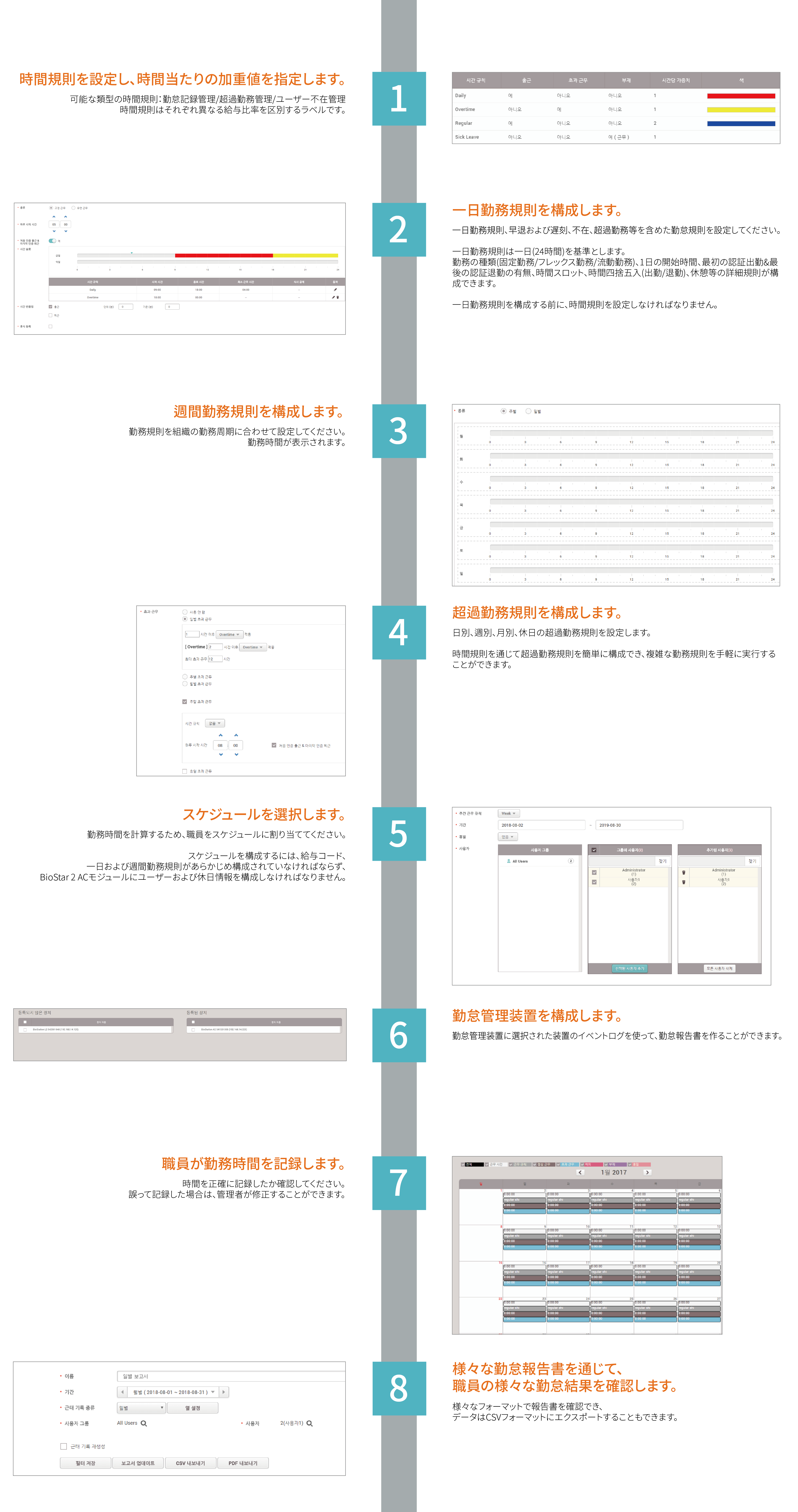 Old revisions ブックに追加 PDF の出力 全て展開する/折り畳む ブッククリエイター このページをブックに追加します。 ブッククリエイター このページをブックから削除します。 修正したブックを表示する。 (0 ページ) ヘルプ システム構成, BioStar 2, Time and Attendance, 勤怠管理 BioStar 2 勤怠管理の作業 BioStar 2の勤怠管理は、構成しやすく直観的なタイムカード機能を使って、構成員の勤務時間をより効率的に管理するようサポートします。BioStar 2の超過勤務規則機能は、管理者に他の時間規則と共に超過時間を簡単に計算し構成できるようにします。 次のように時間および勤務規則を構成し、構成員の勤怠を効率的に管理してみましょう。 参考 Introducing BioStar 2’s Time and Attendance System