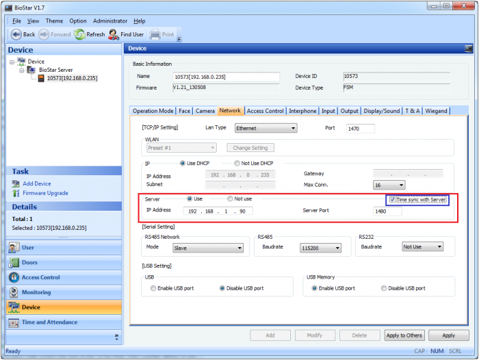 이전 판 책에 추가 PDF로 내보내기 Fold/unfold all 책 생성기 내 책으로 이 페이지 추가 책 생성기 내 책에서 이 페이지 제거 책 관리 (0 페이지) 도움말 BioStar 1, 자동 시간 동기화 자동 시간 동기화 장치의 실제 시간은 주기적으로 보정할 필요가 있습니다. 장치간의 시간이 다르게 설정되어 있다면 심각한 보안 문제의 원인이 될 수 있으며 잘못된 근태 기록이 발생할 수 있습니다. 시간 동기화의 간격은 1 시간이지만 최신 펌웨어로 장치를 업그레이드하면 장치 시간을 1분마다 서버 시간과 동기화할 수 있습니다. 자동 시간 동기화 기능 켜기 자동 시간 동기화 기능을 사용하려면 장치와 PC를 서버 모드로 연결하십시오. 장치 페이지의 네트워크 탭으로 이동하십시오. 서버의 사용 버튼을 클릭하십시오. BioStar 서버의 IP 주소와 포트 번호를 입력하십시오. BioStar 서버의 IP 주소와 포트 번호는 BioStar Server Config 프로그램에서 확인할 수 있습니다. 서버와 자동으로 시간 동기화의 체크 박스를 클릭하십시오. 설정을 저장하려면 적용을 클릭하십시오.