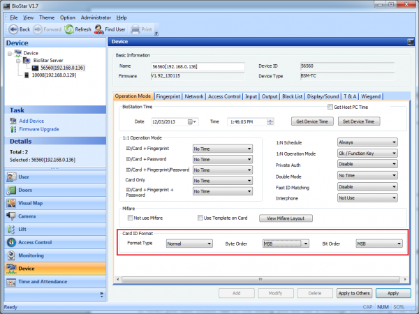 이전 판 책에 추가 PDF로 내보내기 Fold/unfold all 목차 카드 ID 포맷의 MSB와 LSB 설정 BioStar 1의 Byte Order와 Bit Order Byte Order와 Bit Order를 모두 MSB로 설정한 경우 Byte Order를 MSB로 설정하고 Bit Order를 LSB로 설정한 경우 Byte Order를 LSB로 설정하고 Bit Order를 MSB로 설정한 경우 Byte Order를 LSB로 설정하고 Bit Order를 LSB로 설정한 경우 책 생성기 내 책으로 이 페이지 추가 책 생성기 내 책에서 이 페이지 제거 책 관리 (0 페이지) 도움말 BioStar 1, MSB, LSB, 카드 ID 카드 ID 포맷의 MSB와 LSB 설정 이 문서는 장치 메뉴의 동작모드 탭에서 설정할 수 있는 카드 ID 포맷에 대해 설명합니다. BioStar 1의 Byte Order와 Bit Order MSB와 LSB는 비트를 읽는 순서를 의미합니다. (최상위 비트 (MSB), 최하위 비트 (LSB)) MSB는 2진수 데이터에서 가장 높은 자리(가장 왼쪽)의 비트를 먼저 읽으며, LSB는 가장 낮은 자리(가장 오른쪽)의 비트를 먼저 읽습니다. 카드 ID가 3,829,098,359인 MIFARE Classic를 가지고 있다고 가정해봅시다. 이 카드 ID를 2진수로 변환하면 아래와 같이 됩니다. 11100100001110110110011101110111 Bit Order가 MSB일 때 카드 ID를 읽으면 11100100 00111011 01100111 01110111이 되며, LSB일 때 카드 ID를 읽으면 11101110 11100110 11011100이 됩니다. BioStar 1에서는 Byte Order의 개념도 함께 사용합니다. 1바이트는 8개의 비트로 이루어져 있으며, 위 MIFARE Classic 카드는 아래와 같이 표현됩니다. 11100100 00111011 01100111 01110111 Byte Order와 Bit Order를 이용하여 카드 ID를 다르게 읽을 수 있습니다. Byte Order와 Bit Order를 모두 MSB로 설정한 경우 대부분의 경우 Byte Order와 Bit Order를 MSB로 설정하여 사용합니다. 카드를 읽은 결과는 아래와 같습니다. 10진수: 3,829,098,359 2진수: 11100100 00111011 01100111 01110111 Byte Order를 MSB로 설정하고 Bit Order를 LSB로 설정한 경우 BioStar 1는 카드 ID를 Bit Order에 따라 먼저 정렬한 뒤 Byte Order에 따라 분류합니다. 즉. Bit Order가 LSB로 설정되어 있으므로 11101110 11100110 11011100 00100111으로 읽은 뒤 Byte Order에 따라 11101110 11100110 11011100 00100111로 정렬합니다. 카드를 읽은 결과는 아래와 같습니다. 10진수: 4,008,107,047 2진수: 11101110 11100110 11011100 00100111 Byte Order를 LSB로 설정하고 Bit Order를 MSB로 설정한 경우 이 경우 Bit Order에 따라 11100100 00111011 01100111 01110111로 읽은 뒤 Byte Order에 따라 01110111 01100111 00111011 11100100으로 정렬합니다. 카드를 읽은 결과는 아래와 같습니다. 카드 ID: 2,003,254,244 2진수 값: 01110111 01100111 00111011 11100100 Byte Order를 LSB로 설정하고 Bit Order를 LSB로 설정한 경우 이 경우 Bit Order에 따라 11101110 11100110 11011100 00100111로 읽은 뒤 Byte Order에 따라 00100111 11011100 11100110 11101110으로 정렬합니다. 카드를 읽은 결과는 아래와 같습니다. 카드 ID: 668,788,462 2진수 값: 00100111 11011100 11100110 11101110