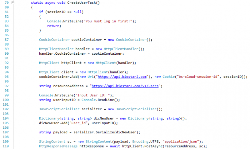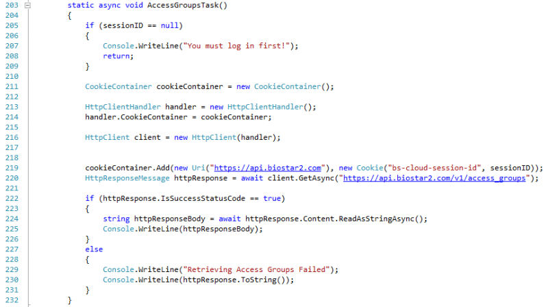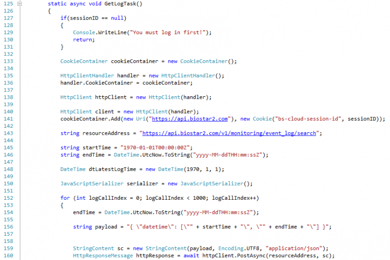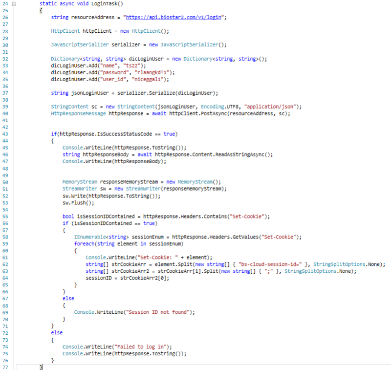 • 211행: BioStar 서버로 세션 ID 정보를 전송하는 데 CookieContainer 클래스를 사용합니다.