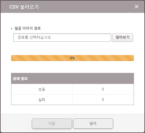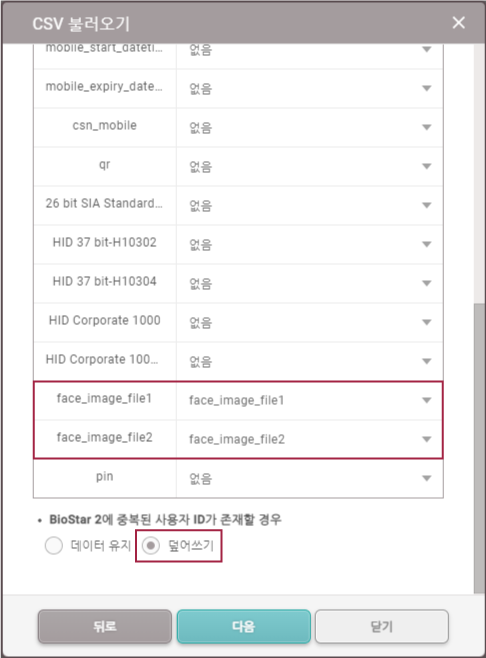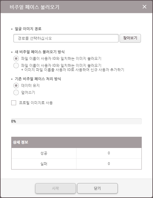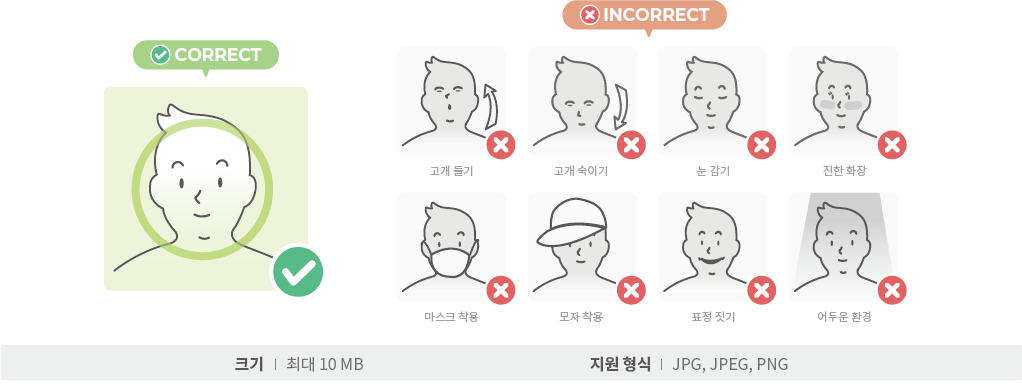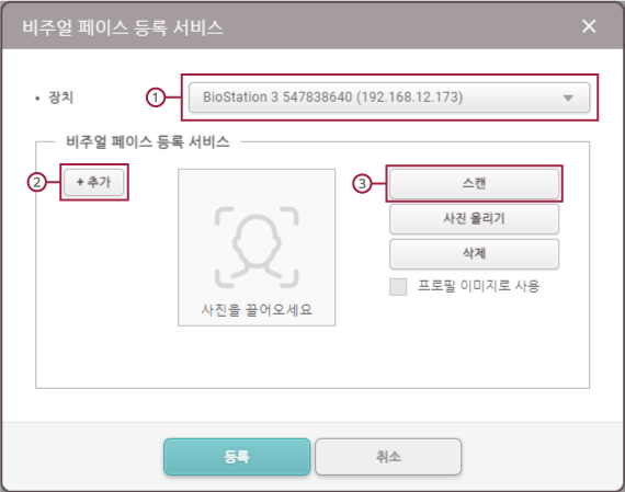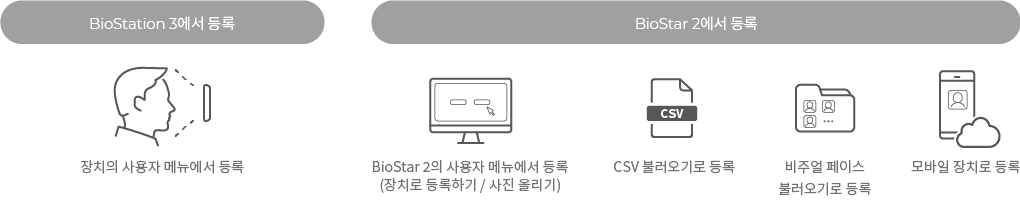이전 판 책에 추가 PDF로 내보내기 Fold/unfold all 목차 BioStation 3에서 얼굴 크리덴셜 올바르게 사용하기 비주얼 페이스 등록 시 주의사항 BioStation 3에서 비주얼 페이스 등록하기 1. '사용자 등록 마법사'로 비주얼 페이스 등록하기 2. '사용자' 메뉴에서 비주얼 페이스 등록하기 BioStar 2에서 비주얼 페이스 등록하기 1. 얼굴 스캔으로 등록하기 2. 사진으로 등록하기 사진 업로드 시 주의사항 3. CSV 불러오기로 등록하기 4. 비주얼 페이스 불러오기로 등록하기 비주얼 페이스 모바일 등록 서비스로 등록하기 얼굴 인증 시 주의 사항 책 생성기 내 책으로 이 페이지 추가 책 생성기 내 책에서 이 페이지 제거 책 관리 (0 페이지) 도움말 BioStation 3에서 얼굴 크리덴셜 올바르게 사용하기 BioStation 3는 비주얼 페이스를 인증 수단으로 사용합니다. 비주얼 페이스는 기존 얼굴 인증 단말기에서 사용하는 얼굴 템플릿과 구분되는 인증 수단으로, 다양하고 편리한 방법으로 얼굴을 등록할 수 있습니다. 이 페이지에는 비주얼 페이스를 올바르게 등록하고 사용하는 방법과 얼굴 등록, 인증 시 주의사항을 포함하고 있습니다. 아래와 같이 여러가지 방법으로 비주얼 페이스를 등록할 수 있습니다. 장치에서 직접 등록하거나 BioStar 2 또는 모바일 장치에서 등록할 수 있습니다. 비주얼 페이스 등록 시 주의사항 얼굴을 등록할 때 장치와 얼굴의 거리를 60 ~ 100 cm로 유지하세요. 표정이 변하지 않도록 주의하세요. 마스크, 모자, 선글라스, 안대 등을 착용하지 마세요. 고개를 들거나 숙이지 마세요. 진한 화장을 하지 마세요. 눈을 감지 마세요. 화면에 양쪽 어깨가 모두 나타나도록 하세요. 보정된 사진은 사용하지 마세요. 움직이지 말고 정면으로 서서 얼굴을 등록하세요. 두 명의 얼굴이 화면에 동시에 나타나지 않도록 주의하세요. 한 번에 한 사람씩 등록하세요. 어두운 곳에서 얼굴을 등록하지 마세요. BioStation 3에서 비주얼 페이스 등록하기 1. '사용자 등록 마법사'로 비주얼 페이스 등록하기 을 누른 뒤 관리자 권한 인증 수단으로 인증하세요. 대시보드에서 사용자 등록 마법사를 누르세요. 사용자 이름을 입력한 다음 얼굴 아이콘에 체크되었는지 확인하고 다음을 누르세요. 화면 중앙에 얼굴이 위치하도록 거리를 조정하고, 장치의 카메라를 정면으로 바라보세요. 촬영이 완료되면 확인 → 저장을 누르세요. 얼굴을 다시 촬영하려면 재촬영을 누르세요. 2. '사용자' 메뉴에서 비주얼 페이스 등록하기 을 누른 뒤 관리자 권한 인증 수단으로 인증하세요. 사용자 → 를 선택하세요. 사용자 이름을 입력한 다음 얼굴 아이콘에 체크되었는지 확인하고 다음을 누르세요. 화면 중앙에 얼굴이 위치하도록 거리를 조정하고, 장치의 카메라를 정면으로 바라보세요. 촬영이 완료되면 확인 → 저장을 누르세요. 얼굴을 다시 촬영하려면 재촬영을 누르세요. BioStar 2에서 비주얼 페이스 등록하기 1. 얼굴 스캔으로 등록하기 BioStar 2 2.9.0 버전 이상에서는 기본적으로 비주얼 페이스 크리덴셜 및 BioStation 3를 지원합니다. BioStar 2 장치 메뉴에서 BioStation 3를 추가하세요. BioStar 2 사용자 메뉴에서 비주얼 페이스를 등록할 사용자를 선택하세요. 크리덴셜 목록에서 비주얼 페이스를 선택하세요. BioStation 3 장치를 선택하고 + 추가를 클릭하세요. 스캔을 클릭하면 장치에서 얼굴 스캔이 시작됩니다. BioStation 3 장치 앞에서 얼굴을 스캔하세요. 스캔 완료된 얼굴을 확인할 수 있습니다. 스캔된 얼굴은 사용자 프로필 이미지로도 사용할 수 있습니다. 2. 사진으로 등록하기 얼굴을 직접 스캔하지 않고 사진 파일을 업로드하여 비주얼 페이스를 등록할 수도 있습니다. 사진 파일로 비주얼 페이스를 등록하려면 사진 올리기를 클릭하거나 사진을 끌어오세요 영역에 사진 파일을 드래그 & 드롭하세요. 지원되는 이미지 파일 형식은 JPG, JPEG 및 PNG입니다. 지원되는 이미지 파일 크기는 최대 10MB입니다. 사진 업로드 시 주의사항 마스크, 모자, 선글라스, 안대 등을 착용하지 마세요. 고개를 들거나 숙이지 마세요. 진한 화장을 하지 마세요. 눈을 감지 마세요. 화면에 양쪽 어깨가 모두 나타나도록 하세요. 보정된 사진은 사용하지 마세요. 어두운 곳에서 촬영된 사진은 사용하지 마세요. 단체사진은 사용하지 마세요. 3. CSV 불러오기로 등록하기 CSV 불러오기로 사용자의 비주얼 페이스를 등록할 수 있습니다. BioStar 2 사용자 메뉴에서 CSV로 저장할 사용자를 선택한 다음 을 클릭한 후 CSV 내보내기를 클릭하세요. CSV 파일의 우측 맨 끝에 face_image_file1, face_image_file2 열을 추가하고 다음 행에 등록할 얼굴 사진의 파일명을 확장자를 포함하여 입력한 다음 저장하세요. BioStar 2 사용자 메뉴에서 비주얼 페이스를 등록할 사용자를 선택한 다음 을 클릭한 후 CSV 불러오기를 클릭하세요. 찾아보기를 클릭해 CSV 파일이 저장된 경로를 선택하고 다음을 클릭하여 얼굴 사진을 추가한 CSV 파일을 BioStar 2로 불러오세요. CSV 파일의 사용자 데이터 필드와 BioStar 2의 사용자 데이터 필드가 자동으로 매핑되어 나타납니다. 다시 매핑을 클릭하면 이름이 동일한 필드끼리 재매핑됩니다. 매핑된 필드를 확인하고 