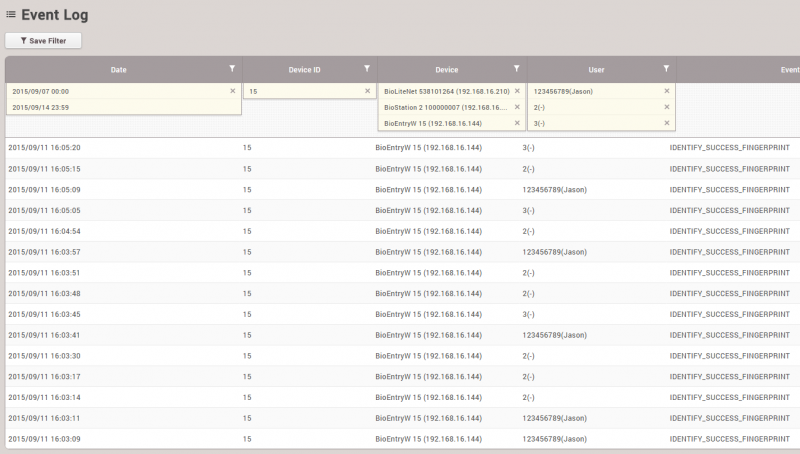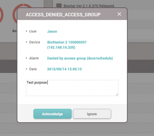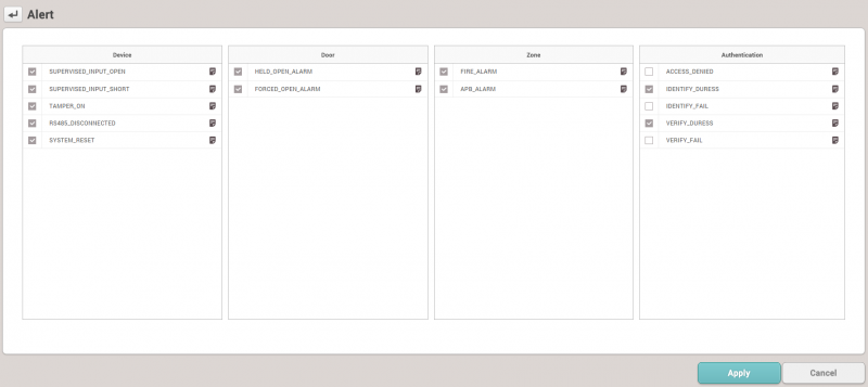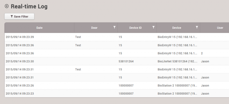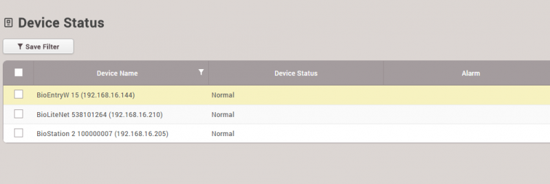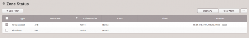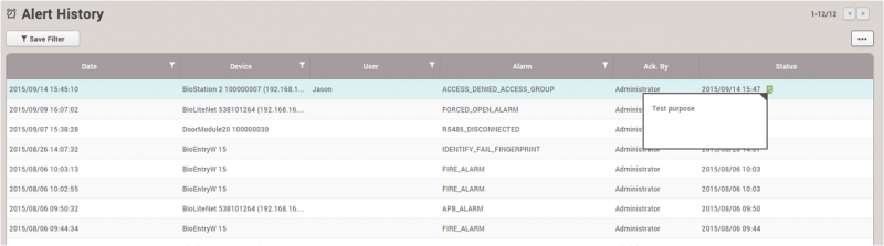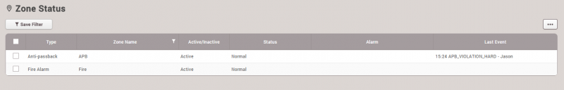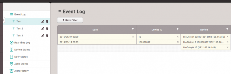 이전 판 책에 추가 PDF로 내보내기 Fold/unfold all 목차 모니터링 사용하기 이벤트 로그 실시간 로그 장치 상태 출입문 상태 구역 상태 경보 이력 책 생성기 내 책으로 이 페이지 추가 책 생성기 내 책에서 이 페이지 제거 책 관리 (0 페이지) 도움말 시스템 구성, BioStar 2, 모니터링 모니터링 사용하기 모니터링에서는 각 이벤트 범주를 보다 쉽게 감지하고 파악할 수 있도록 다양한 모니터링 종류를 지원합니다. 이벤트 로그 모든 이벤트가 나열되지만 자동으로 업데이트되지는 않으므로 새 이벤트를 표시하려면 브라우저에서 새로 고침을 수행해야 합니다. 이벤트 로그는 과거의 특정 이벤트를 빠르고 쉽게 검색할 목적으로 사용합니다. 손쉽게 검색하고 선택된 이벤트를 표시하려면 필터를 설정하고 저장하십시오. 1. 각 열에 있는 깔때기 모양의 아이콘을 클릭한 뒤 필터링 및 검색할 이벤트 종류를 선택하십시오. 2. 필터링 조합을 저장하고 고정 검색 옵션으로 참조할 수 있습니다. 실시간 로그 실시간으로 이벤트를 업데이트하고 표시합니다. 하지만 이벤트를 표시하기 위한 페이지가 제한되어 있기 때문에 최신 이벤트만 표시됩니다. 실시간으로 발생하는 이벤트를 모니터링할 목적으로 사용합니다. 브라우저에서 새로 고침을 수행하면 표시된 이벤트 데이터가 지워집니다. 장치 상태 장치 관련 알람 이벤트 및 해제 옵션과 함께 장치 상태를 표시합니다. 장치 연결, 장치 레벨 알람 이벤트 등 장치 상태를 확인할 목적으로 사용합니다. 장치 알람: Supervised Input, 탬퍼, RS485 연결 해제, 시스템 초기화 출입문 상태 릴레이 상태 및 출입문 제어 옵션과 함께 출입문 상태를 표시합니다. 클라이언트 브라우저에서 릴레이 상태를 확인하고 출입문을 수동으로 관리하여 출입문을 열거나 닫기 위한 목적으로 사용합니다. 출입문 제어 버튼 잠김: 출입문 릴레이를 잠그고, BioStar 2 클라이언트에서 '잠금 해제' 또는 '열림' 버튼을 누르기 전까지 열리지 않도록 합니다. 잠금 해제: 출입문 릴레이를 잠금 해제하고, BioStar 2 클라이언트에서 '잠김' 또는 '열림' 버튼을 누르기 전까지 잠기거나 정상 상태가 되지 않도록 합니다. 열림: 사전 정의된 기간 동안 출입문 릴레이를 엽니다. 알람 해제: 강제 열림/장시간 열림과 단일 출입문 APB 등 출입문 관련 알람 이벤트를 확인하고 해제합니다. APB 초기화: 단일 출입문 APB 위반 및 사용자의 출입 상태를 초기화하여 기본 상태로 만듭니다. 즉, 사용자가 이전의 출입 이벤트에 관계없이 출입문을 통과할 수 있습니다. 구역 상태 구역 상태와 해당 알람 켜기/끄기 옵션을 표시합니다. 구역 상태를 확인하고 구역 관련 알람을 해제하기 위한 목적으로 사용합니다. 구역 알람: 로컬 APB, 화재 경보 구역 상태을 사용하려면 출입통제 일반 라이선스가 활성화되어 있어야 합니다. 브라우저에서 새로 고침을 수행한 뒤 다른 메뉴로 이동하면 마지막 이벤트가 브라우저에서 지워집니다. 1. APB 위반 이벤트가 발생하면 구역에 마지막 이벤트와 함께 APB 규칙을 위반한 사용자 이름이 표시됩니다. 2. APB 상태를 초기화해야 하는 경우에는 APB 구역을 클릭한 뒤 APB 초기화를 클릭하십시오. APB 초기화는 이전 상태에 관계없이 모든 사용자가 출입문을 통과할 수 있는 기본 상태로 구역을 설정합니다. 미래에 업데이트될 버전에서는 개별 APB 초기화가 지원될 것입니다. 경보 이력 BioStar 2는 선택한 경보 이벤트를 받고 나중에 참조할 수 있도록 메모를 남길 수 있는 확인 메모 옵션을 지원합니다. 과거 경보 이력 그리고 알람 이벤트를 처리하기 위해 수행한 동작을 확인할 목적으로 사용합니다. 경보를 받으려면 글로벌 설정에서 경보를 내보내도록 이벤트를 설정해야 합니다. 1. 설정 > 경보를 클릭하십시오. 2. 경보를 내보낼 이벤트를 표시하고 확인을 클릭하십시오. 3. 경보 메시지 상자를 선택하고 수행한 동작을 메모 섹션에 입력합니다. 4. 모니터링 > 경보 이력을 클릭하십시오. 상태 섹션에서 메모 아이콘을 클릭합니다. 이 이벤트를 처리할 때 남겨 놓은 메모를 확인할 수 있습니다.