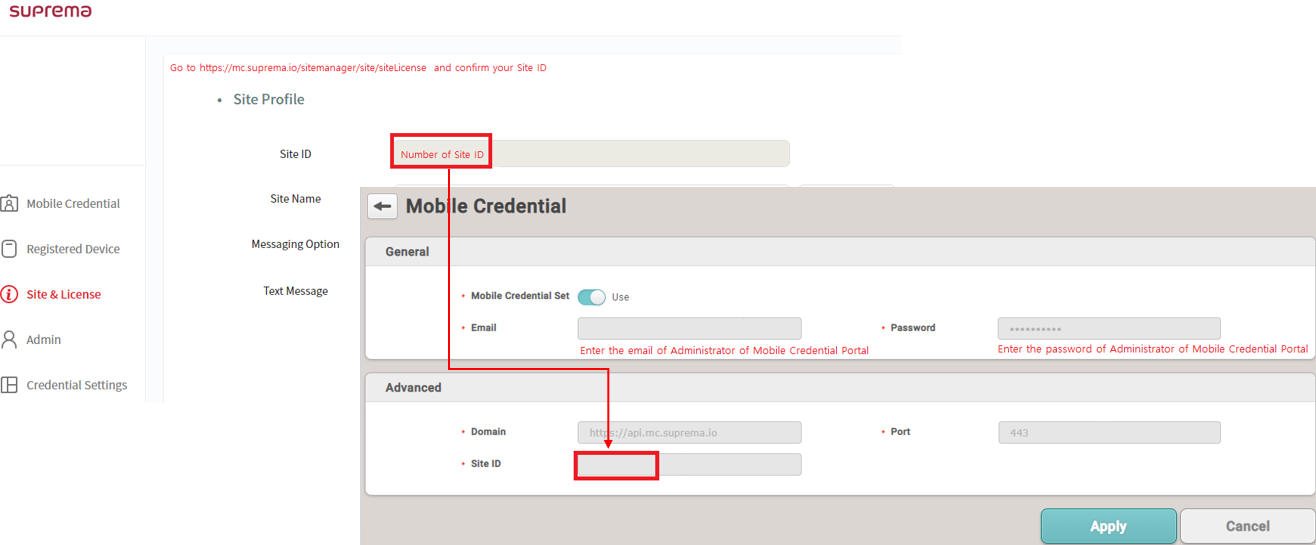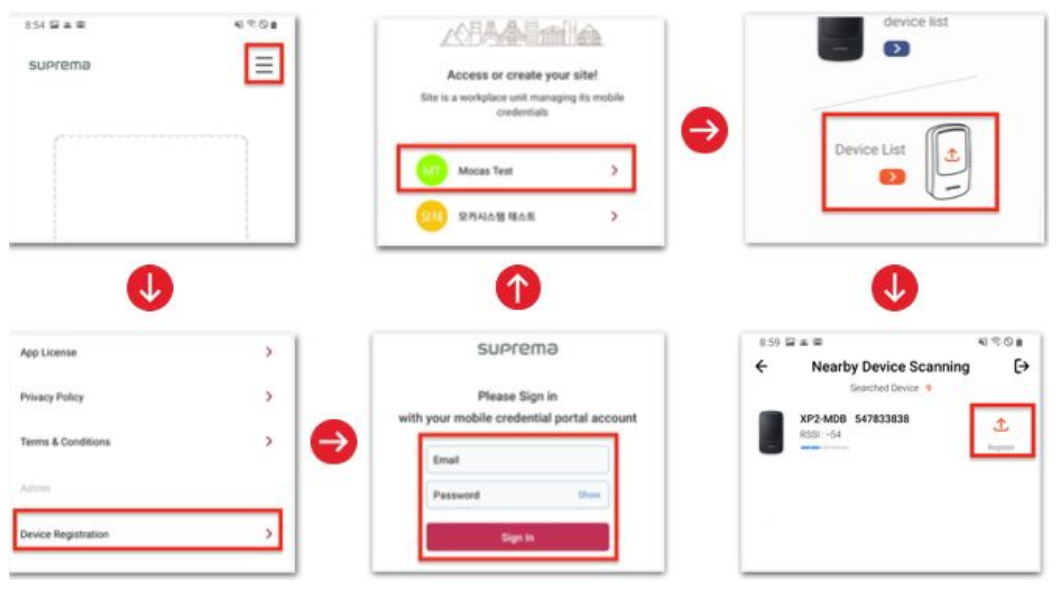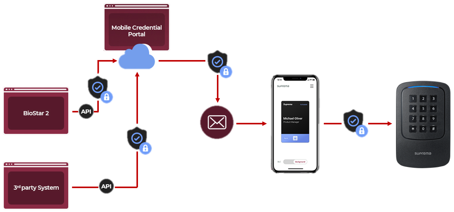 이전 판 책에 추가 PDF로 내보내기 Fold/unfold all 목차 슈프리마 모바일 크리덴셜 사용하기 개요 BioStar 2와 함께 슈프리마 모바일 크리덴셜을 사용하는 방법 전반적인 절차 1단계: 슈프리마 모바일 크리덴셜 포털에 가입하십시오. 2단계: 슈프리마 모바일 크리덴셜 앱에서 장치를 등록하십시오. 3단계: BioStar 2 설정에서 슈프리마 모바일 크리덴셜 포털 정보를 구성하십시오. 4단계: BioStar 2에 장치를 추가하십시오. 5단계: BioStar 2에 새 사용자를 추가하십시오. 6단계: 장치에서 모바일 크리덴셜로 인증하십시오. 추가 단계: 슈프리마 모바일 크리덴셜 포털 크레딧의 개수를 확인하십시오. 상세 절차 1. 슈프리마 모바일 크리덴셜 포털 가입하십시오. 2. 슈프리마 모바일 크리덴셜 앱에서 장치를 등록하십시오. 3. BioStar 2 설정에서 슈프리마 모바일 크리덴셜 포털 정보를 구성하십시오. 4. BioStar 2에 장치를 추가하십시오. 5. BioStar 2에 새 사용자를 추가하십시오. 5-1. 사용자에게 모바일 크리덴셜을 발급하십시오. BioStar 2에서 모바일 크리덴셜 정보를 슈프리마 모바일 크리덴셜 포털로 전송합니다. 6. 모바일 장치로 이메일을 확인해 모바일 크리덴셜을 생성한 뒤, 모바일 크리덴셜로 인증하십시오. 6-1. 사용자의 모바일 장치로 BioStar 2에 새로 등록한 사용자의 이메일을 확인하여 전송 받은 다운로드 링크를 클릭하십시오. 6-2. 요청된 항목의 입력 필드에 올바른 값이 입력되었는지 확인하십시오. 6-3. 모바일 장치에서 BLE 또는 NFC 기능을 실행하십시오. 6-4. 모바일 크리덴셜을 장치에 가까이 대십시오. 7. 추가 단계 I: 크레딧 개수를 확인하는 방법 8. 추가 단계 II: 크리덴셜 개수를 확인하는 방법 모바일 크리덴셜에 대한 추가 정보 모바일 크리덴셜 관련 참조 링크 모바일 크리덴셜 Q&A 책 생성기 내 책으로 이 페이지 추가 책 생성기 내 책에서 이 페이지 제거 책 관리 (0 페이지) 도움말 슈프리마 모바일 크리덴셜 사용하기 개요 버전 2.7.12 이전에 BioStar 2는 사용자의 출입 인증을 위한 수단으로서 지문, 얼굴, 카드, PIN을 지원했습니다. 그리고 이제 BioStar 2 버전 2.7.12에서부터 새로운 인증 수단인 슈프리마 모바일 크리덴셜을 지원합니다. 이제 사용자들은 어떤 출입문에서나 자신의 스마트폰을 인증 수단으로 사용할 수 있습니다. 슈프리마 모바일 크리덴셜을 통해 타사 컨트롤러와의 손쉬운 연동 방법을 찾고, 향상된 사용자 편의성을 경험해 보세요. 이 문서는 BioStar 2에서 슈프리마 모바일 크리덴셜을 설정하는 방법을 설명합니다. 이 문서의 하단에서 제공하는 다양한 링크를 통해 슈프리마 모바일 크리덴셜에 대한 추가적인 정보도 찾아볼 수 있습니다. [슈프리마 모바일 크리덴셜 데이터의 흐름] 슈프리마 모바일 크리덴셜과 BioStar 2 모바일 카드는 서로 다른 제품입니다. 슈프리마 모바일 크리덴셜을 슈프리마 장치에서 직접 등록할 수는 없습니다. BioStar 2를 통해 할당하거나 수동으로 카드 번호를 입력하십시오. 슈프리마 모바일 포털은 최초로 설치된 장치를 등록할 수 있습니다. XPass 2를 포함하여 이미 BioStar 2에 등록되어 사용 중인 장치가 있을 경우, 모든 사용자 데이터를 삭제하고 BioStar 2에서 장치를 제거한 뒤 슈프리마 모바일 크리덴셜을 시작하기 전에 재설정해야 합니다. 이와 같은 경우의 각 단계에 대해서는 (링크)를 참조하십시오. BioStar 2와 함께 슈프리마 모바일 크리덴셜을 사용하는 방법 전반적인 절차 이 부분은 설정 방법에 대해 간단히 설명합니다. 자세한 과정이 필요한 경우 이 부분을 건너뛰고 하단의 2. 세부 절차로 이동하십시오. 1단계: 슈프리마 모바일 크리덴셜 포털에 가입하십시오. 슈프리마 모바일 크리덴셜 포털(https://mc.suprema.io)에 접속하십시오. 모바일 크리덴셜 포털에 가입한 뒤 사이트를 개설하십시오. 새 사이트를 만들면 테스트를 위해 5개의 크레딧이 기본 제공됩니다. 2단계: 슈프리마 모바일 크리덴셜 앱에서 장치를 등록하십시오. 모바일 장치에 슈프리마 모바일 크리덴셜 앱을 다운로드한 뒤 슈프리마 모바일 크리덴셜 포털의 가입 정보를 입력해 로그인하십시오. > 장치 등록을 눌러 장치를 등록하십시오. BioStar 2에서 직접 장치를 등록할 수도 있습니다. 3단계: BioStar 2 설정에서 슈프리마 모바일 크리덴셜 포털 정보를 구성하십시오. BioStar 2에서 설정 > 모바일 크리덴셜로 이동한 뒤 도메인, 포트, 사이트 ID, 이메일, 암호 등의 정보를 입력하십시오. 4단계: BioStar 2에 장치를 추가하십시오. BioStar 2에 접속한 뒤 장치 > 간편 검색 또는 고급 검색을 클릭해 장치를 추가하십시오. 장치가 이미 BioStar 2에 등록되어 있는 경우, Link를 참조하십시오. 모바일 크리덴셜을 사용할 수 있는 장치와 펌웨어 버전은 아래와 같습니다. XPass 2 펌웨어 1.1.0 이상 XPass D2(Rev 2) 펌웨어 1.0.0 이상 슈프리마는 다른 장치에도 모바일 크리덴셜 기능을 제공할 예정입니다. 각 장치별 지원 일정은 슈프리마 영업 담당자 또는 슈프리마 공식 파트너에게 문의하십시오. 5단계: BioStar 2에 새 사용자를 추가하십시오. BioStar 2에 접속한 뒤 사용자 > 사용자 추가를 클릭하십시오. 사용자 이름과 이메일 주소를 입력하십시오. 크리덴셜 