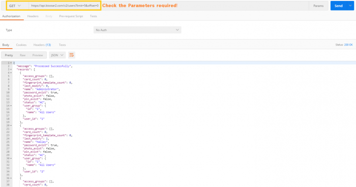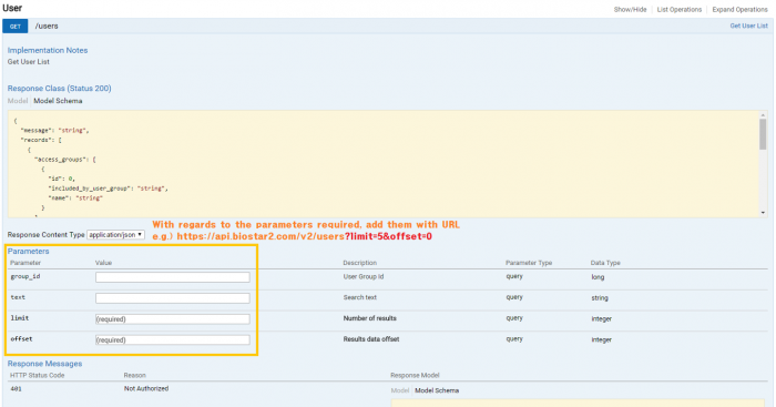 1) Parameters 섹션에서 Parameter를 확인하십시오. limitoffset은 모두 URL Parameters와 같이 필수입니다.
