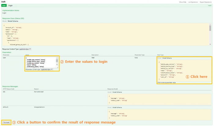 Swagger UI를 통해 BioStar 2 API에 대한 정보를 제공하므로, API를 호출하기 전 API의 종류와 모델 스키마(Model Schema)를 확인할 수 있습니다. 다음은 로그인 API를 사용하여 이 툴을 활용하는 방법의 예시입니다.