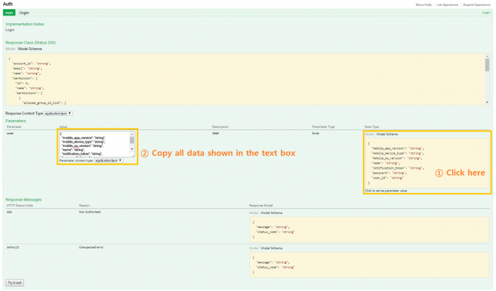 1) Parameters 섹션에서 Model Schema에 대한 노란색 박스를 클릭하십시오. 박스의 내용이 복사되어 동일한 섹션의 Value(흰색 박스)에 붙여 넣어집니다.