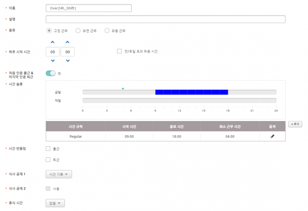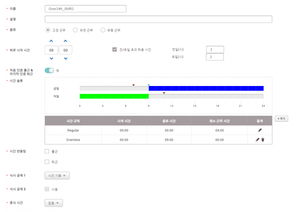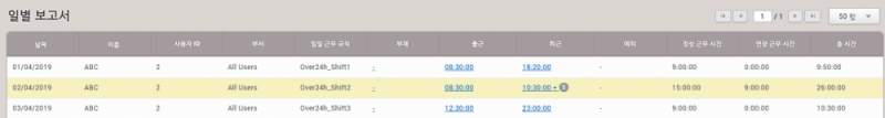 이전 판 책에 추가 PDF로 내보내기 Fold/unfold all 책 생성기 내 책으로 이 페이지 추가 책 생성기 내 책에서 이 페이지 제거 책 관리 (0 페이지) 도움말 24시간 초과 근무에 대한 근태 규칙 구성 샘플 BioStar 2.7.2 이전 버전에서는 24시간을 초과하는 근무 시간에 대한 근태를 관리할 수 없었습니다. 왜냐하면 하루 시작 시간을 기준으로 이전은 전날로, 이후는 다음날로 처리되었기 때문입니다. BioStar 2.7.2 버전에서 전/후일 초과 허용 시간 옵션이 추가되어, 설정한 하루 시작 시간을 기준으로 24시간을 초과한 근무 시간에 대해 근무 규칙을 적용하고 근태를 계산할 수 있습니다. 전/후일 초과 허용 시간은 전일과 후일 모두 최대 6시간까지 설정할 수 있습니다. 다음은 전/후일 초과 허용 시간 옵션을 이용해 24시간 이상 근무 규칙을 적용할 수 있는 방법의 예시입니다. 서로 다른 세 개의 근무 규칙이 있습니다. 직원 스케줄 설정 예시: D 회사 이 직원은 4일에 한 번씩 야간 근무를 합니다. 1일차 : 09:00 - 18:00 2일차 : 09:00 - 09:00 (00:00-09:00 초과 근무) 3일차 : 13:00 - 22:00 4일차 : 휴일 5일차 : 09:00 - 18:00 6일차 : 09:00 - 09:00 … … 근무 규칙 1 - 1일차, 5일차, 9일차… 근무 규칙 2 - 2일차, 6일차, 10일차… 근무 규칙 3 - 3일차, 7일차, 11일차… 휴일 - 4일차, 8일차, 12일차… 근무 규칙이 겹치지 않도록 전날의 '하루 시작 시간' 뒤에 다음 날의 '하루 시작 시간'을 구성해야 합니다. 주간 근무 규칙 일별 보고서 일별 보고서에서 4월 2일의 총 근무 시간이 26시간으로 기록된 것을 확인할 수 있습니다.