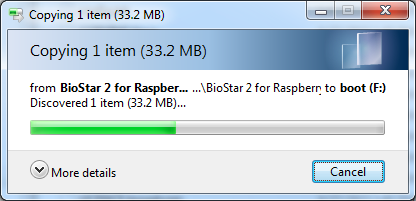이제 SD 카드에 라즈베리파이 운영 시스템이 성공적으로 복사되었습니다. SD 카드의 루트(Root) 디렉터리에 BioStar 2 파일을 복사하십시오.