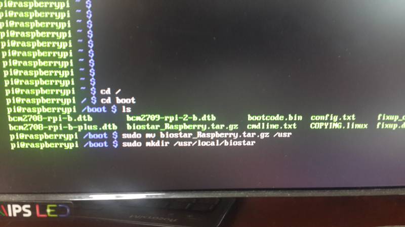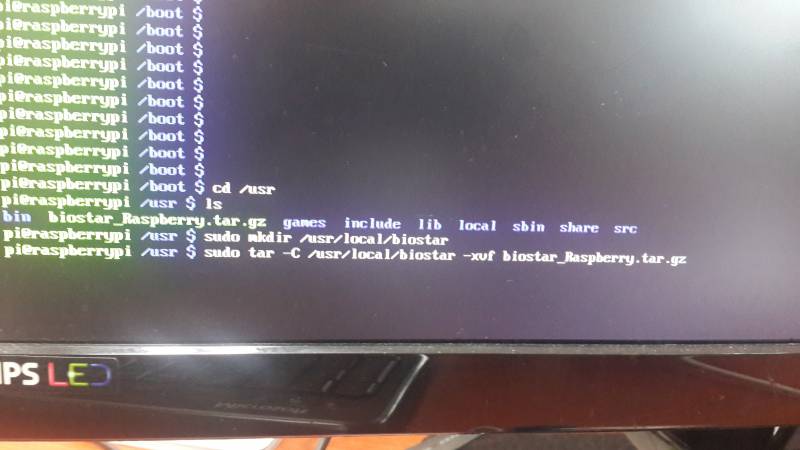 cd /boot를 입력한 뒤 <Enter> 키를 누르십시오. 그런 다음 sudo mv biostar_Raspberry.tar.gz /usr를 실행하십시오. 이 명령은 BioStar 2 압축 파일을 루트 디렉터리에서 usr 디렉터리로 이동합니다.