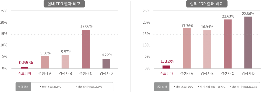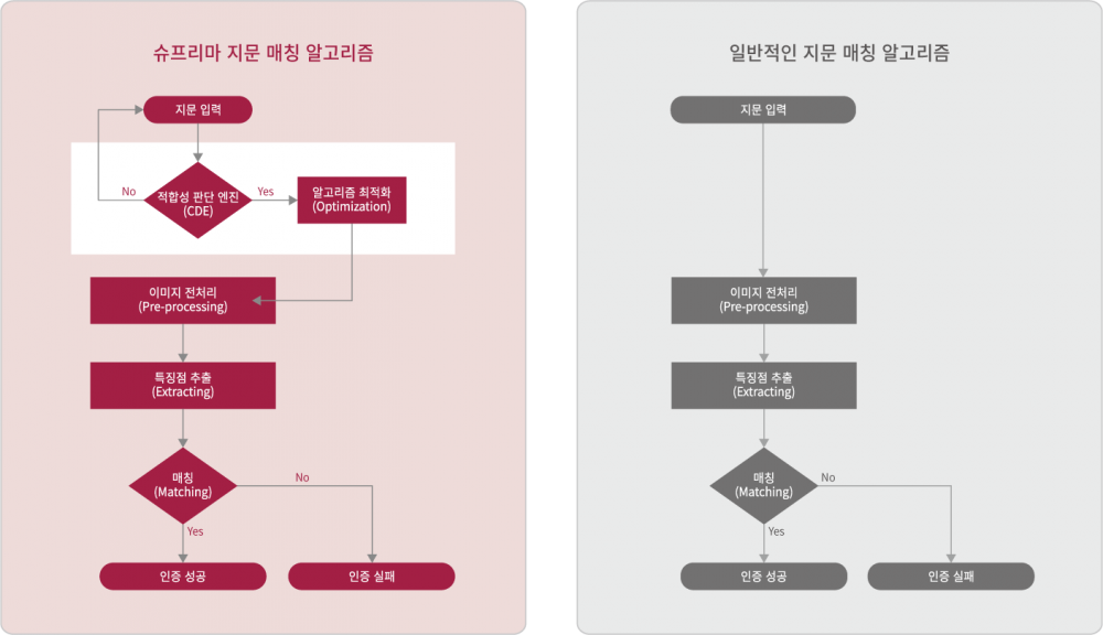 이전 판 책에 추가 PDF로 내보내기 Fold/unfold all 책 생성기 내 책으로 이 페이지 추가 책 생성기 내 책에서 이 페이지 제거 책 관리 (0 페이지) 도움말 문서의 이전 판입니다! 지문 알고리즘, FRR, 건조 지문 건조 지문에 대한 슈프리마의 지문 인식 알고리즘 성능 “경쟁사 대비 최대 31배 뛰어난 인증 성능” 대한민국의 겨울은 기온이 낮아지고 바람이 자주 불기 때문에 공기 중의 습도가 낮아집니다. 이에 따라 사람의 피부도 건조해지며 피부의 유분과 수분이 마르기 때문에 손가락이 지문 센서 표면에 접촉되더라도 올바르게 인식되지 않는 건조 지문이 발생합니다. 이처럼 계절의 영향을 받는 것뿐만 아니라 남아프리카, 오스트레일리아, 중동과 같이 지리적으로 건조한 지역에서도 건조 지문이 쉽게 발생할 수 있습니다. 또한, 사람의 직업이나 나이에도 쉽게 영향을 받으며, 손을 자주 소독해야 하는 의사, 목재, 가죽, 금속 등을 주로 다루는 작업자, 피부 건조증을 가진 환자, 고령의 노인도 건조 지문이 발생할 수 있습니다. 건조 지문이 발생하면 지문 센서의 표면에 손가락이 제대로 접촉되지 않아서 흐릿한 지문 이미지가 획득됩니다. 흐릿한 지문 이미지는 일반적인 지문 이미지에 비해 특징점을 추출하기 어렵거나 가짜 특징점(False Minutiae)이 추출될 확률이 높기 때문에 본인 거부율 (FRR, False Rejection Rate)이 높게 나타나는 원인이 됩니다. 건조 지문이 발생하더라도 지문을 인증하기 전에 핸드크림을 바르거나 손가락에 입김을 불어서 일시적으로 완화할 수 있지만, 이것은 근본적인 해결책이 아니기 때문에 지문 인식 성능을 보장할 수 없습니다. 슈프리마의 최신 지문 센서와 알고리즘을 이용하면 이런 문제를 모두 해결할 수 있습니다. 뛰어난 실내외 인증 성능 춥거나 건조한 환경에서 슈프리마의 제품에 적용된 최신 지문 센서는 타사의 지문 센서를 압도하는 성능을 보여줍니다. 이 성능의 차이는 체감적인 것이 아닙니다. 슈프리마는 최신 지문 지문 센서와 뛰어난 알고리즘으로 타사 제품에 비해 실내에서는 약 31배, 실외에서는 약 19배 뛰어난 성능을 제공합니다. 지문 매칭 알고리즘 비교 슈프리마의 지문 매칭 알고리즘은 일반적인 지문 매칭 알고리즘과 다르게 입력된 지문 이미지를 바로 ‘이미지 전처리’ 단계로 넘기지 않고 적합성 판단 엔진(CDE, Conformance Decision Engine)이 먼저 분석합니다. 이 적합성 판단 엔진(CDE)은 지문이 잘못 입력된 경우 즉, 손가락으로 지문 센서 표면을 문지르며 지문을 입력한 경우 등을 분석하여 올바른 지문 이미지를 얻을 수 있도록 도와줍니다. 또한, 딥 러닝 (Deep learning) 기술을 기반으로 획득한 지문 이미지를 분석하며, ‘알고리즘 최적화’ 단계를 거치게 됩니다. 이것은 ‘이미지 전처리’ 단계 이전에 지문 이미지를 먼저 분석하기 때문에 ‘매칭’ 단계까지 거치지 않고도 사용자에게 훨씬 더 빠른 피드백을 제공할 수 있습니다. 슈프리마의 지문 매칭 알고리즘은 적합성 판단 엔진(CDE)를 기반으로 지문 센서와 알고리즘을 효과적으로 제어하여 고품질의 지문 이미지를 획득할 수 있으며, 이를 기반으로 가짜 특징점(False Minutiae)을 제거하는 성능이 뛰어납니다. 슈프리마의 모든 제품은 최적화된 알고리즘 성능과 뛰어난 연산 성능을 기반으로 건조 지문이라도 1초 이내에 지문 매칭을 수행할 수 있으며, 다양한 환경에서도 효과적이고 안정적인 지문 매칭 성능을 제공합니다.
