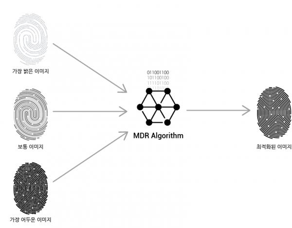 이전 판 책에 추가 PDF로 내보내기 Fold/unfold all 목차 슈프리마 MDR(Multi Dynamic Range) 기술 Multi-dynamic Range (MDR) Technology 20,000 Lux - 간접광 100000 Lux - 직사광선 책 생성기 내 책으로 이 페이지 추가 책 생성기 내 책에서 이 페이지 제거 책 관리 (0 페이지) 도움말 MDR, Multi-dynamic Range, 지문 스캐너 슈프리마 MDR(Multi Dynamic Range) 기술 정해진 위치에 설치되는 지문 인식 장치에 비해 지문 스캐너는 다양한 장소와 환경에서 활용될 확률이 높습니다. 다양한 환경 요소 중 특히 빛(주변광)은 지문 센서가 지문 이미지를 획득하는 과정에 영향을 주기 때문에 장치의 성능을 크게 떨어트리는 요소입니다. 슈프리마의 지문 스캐너 중 BioMini Plus 2, BioMini Combo, BioMini Slim은 기존의 HDR 기술을 발전시킨 MDR (Multi Dynamic Range) 기술을 탑재하여 어떤 환경에서도 고품질의 지문 이미지를 얻을 수 있습니다. 지문의 상태 및 주변광의 밝기와 무관하게 고품질의 지문 이미지를 얻을 수 있기 때문에 어디서든 사용할 수 있습니다. Multi-dynamic Range (MDR) Technology 슈프리마의 MDR 기술은 HDR 기술을 기반으로 슈프리마가 개발한 알고리즘을 적용합니다. 지문을 스캐너에 대는 순간 지문 스캐너는 가장 밝은 이미지, 보통 밝기의 이미지, 가장 어두운 이미지를 각각 촬영하고 알고리즘을 통해 결합합니다. 이 지문 이미지 획득 방법은 밝은 부분을 더 밝게 표현하고 어두운 부분은 더 어둡게 표현할 수 있기 때문에 명암에 따라 세밀하게 조정된 지문 이미지 획득할 수 있도록 도와줍니다. 또한, 건조 지문이나 습한 지문에서도 문제없이 최적의 이미지를 획득할 수 있습니다. 20,000 Lux - 간접광 광원 방향 수직 앞 뒤 옆 MDR ON MDR OFF 100000 Lux - 직사광선 광원 방향 수직 앞 뒤 옆 MDR ON MDR OFF