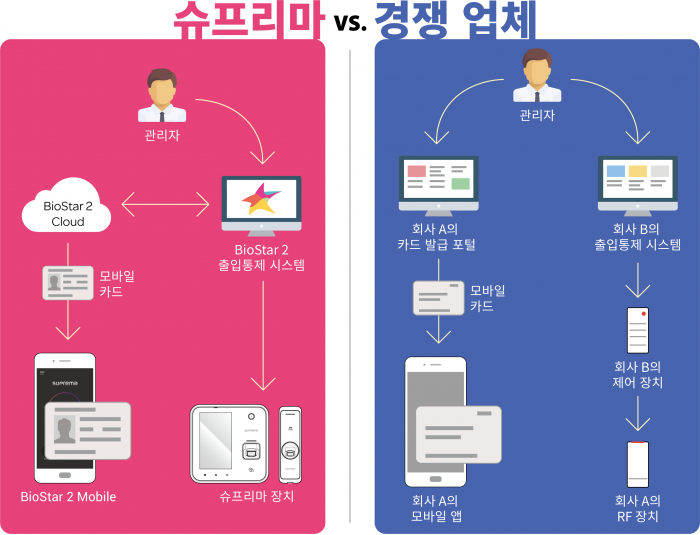 이전 판 책에 추가 PDF로 내보내기 Fold/unfold all 책 생성기 내 책으로 이 페이지 추가 책 생성기 내 책에서 이 페이지 제거 책 관리 (0 페이지) 도움말 문서의 이전 판입니다! BioStar 2 모바일 카드 BioStar 2 모바일 카드 전 세계의 스마트폰 보급률은 이미 50%를 초과했으며, 선진시장의 스마트폰 보급률은 이미 65%에 달하고 있습니다. 빠르게 보급되고 있는 스마트폰에 맞춰 이를 다양한 분야에서 적극적으로 활용하려는 시도는 이미 여러 차례 있었으며, 출입 통제 분야도 마찬가지입니다. 분실하기 쉬운 플라스틱 카드를 대신하여 일상생활에서 항상 사용하는 스마트폰에 사용자 정보와 크리덴셜 정보를 저장할 수 있다면 보안성과 편의성을 함께 도모할 수 있습니다. 스마트폰을 사용자 인증을 위한 크리덴셜로 사용하는 시스템은 이미 여러 회사에서 개발했으며, 근거리 무선 통신(Near Field Communication, NFC) 기술뿐만 아니라 저전력 블루투스(Bluetooth Low Energy)를 이용한 시스템도 개발되었습니다. 하지만, 모바일 카드를 사용하기 위해서는 여전히 별도의 포털 서비스를 통해 유료로 카드를 발급해야 하거나 별도의 인식 장치가 필요한 것은 기존 시스템과 별반 다르지 않았습니다. 슈프리마의 BioStar 2 모바일 카드는 타 시스템처럼 포털 서비스를 이용하지 않고 BioStar 2에서 직접 발급할 수 있습니다. 또한, BioStar 2의 기능을 직접 제어하거나 시스템 로그를 모니터링할 수 있는 BioStar 2 Mobile 앱을 함께 이용하기 때문에 사용자에게 일원화된 사용자 경험(UX)을 제공합니다. 하나의 시스템에서 한 번에 모두. BioStar 2 모바일 카드는 별도의 포털 서비스가 필요하지 않습니다. 이미 사용 중인 BioStar 2나 BioStar 2 Mobile 앱에서 관리자가 모바일 카드를 바로 발급할 수 있으며, 사용자가 전송 받은 모바일 카드를 BioStar 2 Mobile 앱에서 등록만 하면 바로 사용할 수 있습니다. 발급된 카드를 회수하는 과정도 어렵지 않습니다. 수백 수 천 명의 직원에게 출입 카드를 발급하고 방문자를 위한 출입 카드도 별도로 관리해야 한다고 생각해보십시오. 카드 구매 비용, 출입증 인쇄 비용, 관리 비용을 모두 종합해본다면 만만치 않은 시간과 비용이 소요될 것입니다. 하지만, BioStar 2와 BioStar 2 Mobile 앱을 이용하여 직원에게 바이오메트릭 정보와 출입 권한이 저장된 모바일 카드를 발급하고, 방문자에게는 정해진 기간 동안 사용할 수 있는 모바일 카드를 발급할 수 있다고 상상해보십시오. 훨씬 편리하고 절약된 비용으로 시스템을 운영할 수 있을 것입니다. 철저하게 지켜지는 개인 정보. BioStar 2 모바일 카드는 사용자에 대한 일반적인 정보와 출입 권한뿐만 아니라 바이오메트릭 정보도 스마트폰에저장할 수 있습니다. 출입통제 장치에 사용자 정보를 저장하지 않고 스마트폰에 모든 정보를 저장하기 때문에 안전합니다. 또한, 스마트폰의 어떠한 정보도 BioStar 2나 출입통제 장치에 저장하지 않습니다. 사용자는 BioStar 2 모바일 카드로 엑세스 온 카드1)와 보안 크리덴셜 카드2)를 모두 사용할 수 있습니다. NFC와 BLE.가장 진보한 모바일 통신 기술. BioStar 2 Mobile 카드는 NFC와 BLE를 모두 지원합니다. Android 장치는 NFC3)와 BLE를 모두 사용할 수 있으며, iOS 장치는 BLE만 사용할 수 있습니다. * NFC는 호스트 카드 에뮬레이션(HCE)을 지원하는 장치만 사용할 수 있습니다. FAQ BioStar 2 모바일 카드를 사용하려면 무엇이 필요한가요? 먼저, NFC나 BLE를 지원하는 스마트폰인지 확인하십시오. 이미 BioStar 2와 슈프리마 장치를 사용하고 있는 고객이라면 몇 가지 업데이트를 거친 뒤 바로 사용할 수 있을 것입니다. Android 스마트폰일 경우 Android 5.0 Lollipop 이상 버전의 운영체제 iPhone일 경우 iOS 9.0 이상 버전의 운영체제 BioStar 2.4.1 (무료 버전) BioStar 2 Mobile 앱 2.4.1 버전 이상 (무료) NFC 카드나 BLE 카드를 인식할 수 있는 슈프리마 장치 이전에 사용하던 플라스틱 출입 카드도 계속 사용할 수 있나요? 물론입니다. NFC 카드를 사용할 경우 MIFARE, DESFire, FeliCa, iCLASS 계열의 카드를 함께 사용할 수 있으며, Multi-RF 클래스를 지원하는 장치를 사용하면 EM 카드나 HID Prox 카드도 함께 사용할 수 있습니다. BLE 카드는 현재 FaceStation 2의 AWB 모델만 지원되지만 이 모델은 BLE 카드뿐만 아니라 Multi-RF 클래스, NFC 카드도 함께 지원하기 때문에 거의 모든 카드를 인식할 수 있습니다. 모바일 카드와 장치간의 통신은 어떻게 보호되나요? BioStar 2 Mobile 앱은 AES 암호화 알고리즘을 이용하여 사용자의 모든 정보를 보호합니다. BLE와 NFC 통신 모두 128bit AES 암호화 알고리즘을 이용하여 보호하며, 스마트폰에 저장된 데이터도 보호됩니다. 또한, 다른 사용자가 무단으로 사용하는 것을 막기 위해 스마트폰의 잠금 화면, 앱 로그인 등으로도 보호합니다. BioStar 2나 BioStar 2 Mobile 앱을 구매해야 하나요? 아닙니다. BioStar 2 모바일 카드는 BioStar 2.4.1 무료 버전에서 직접 발급할 수 있으며, 별도의 서비스 포털이필요하지 않습니다. 또한, BioStar 2 Mobile 앱도 무료이며 Google Play와 App Store에서 다운로드 받을 수 있습니다. 이미 사용 중인 시스템에서도 사용할 수 있나요? NFC나 BLE를 인식할 수 있는 장치를 사용 중이라면 시스