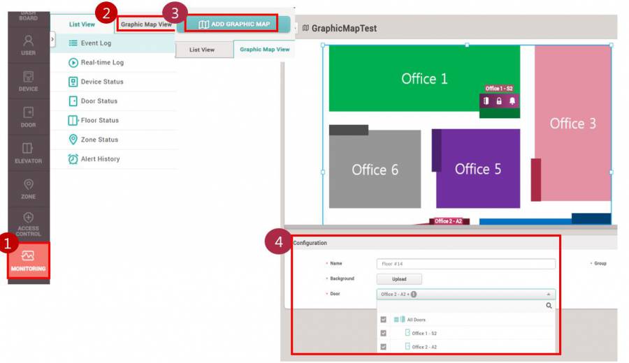 Old revisions Add to book Export to PDF Fold/unfold all Book Creator Add this page to your book Book Creator Remove this page from your book Manage book (0 page(s)) Help System Configuration, BioStar 2, Graphic, Map How to activate Graphic map and how to configure it Graphic Map, which is similar to Visual Map which was supported by BioStar 1, is supported from BioStar 2.7. This is a feature that can visually check the status of each door. To use Graphic Map, AC Advanced or higher license is required. If you activate the license for Advanced or higher, a menu called Graphic Map View will be activated. Go to the 1)Monitoring, 2)Graphic Map View, 3)Add Graphic Map, then a configuration page will show up. 4)Here you can set the name, the background to be created in the graphic map, and the doors you want to add to this map. Background file : Supported files are JPG, JPEG, PNG, BMP and GIF in five and maximum 5 megabytes. Then how does graphic map show each status of door? 1. Log Logs for each door are displayed. The Title Bar is variable in name length, and if it exceeds the maximum width (200), it becomes ellipsis (…). 2. Door control In the graphic map, you can control the door. When you click door here, you will see that the relay status is displayed as open. Can see the relay status? When opened, it is displayed in mint color. If the relay is manual status, it changes to a yellow padlock and door is locked or unlocked unless you release the door. 3. Alarm When the alarm sounds at the door, this status message and the button to clear the alarm are displayed in the graphic map. However, this alarm can not show or clear the status of Trigger & Action, only Alarm (Held door open / Forced door open / APB) set in Door option is displayed and can be cleared. It is also a point to be improved in the future.