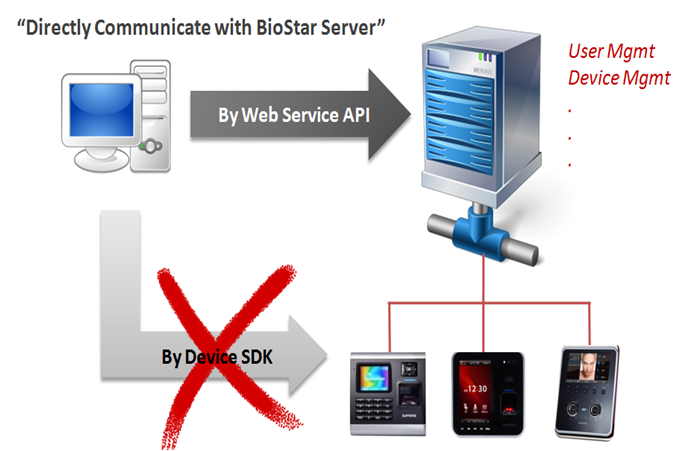 BioStar 2 supports Web API with REST/JSON format for almost of all features including Biometric data management. With this API, developers and system integrators can make an easier interface and system link and can develop own application by referring to source codes provided with BioStar 2 extension modules. (BioStar 2 extension module indicates features besides access control core functionalities, such as T&A and Video.)