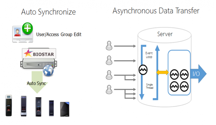 Furthermore, BioStar 2 adopted asynchronous data transfer type which makes it possible to use a device while transferring data from a server to a device. So, users do not need to wait until data transfer finishes and use a device without noticing anything.