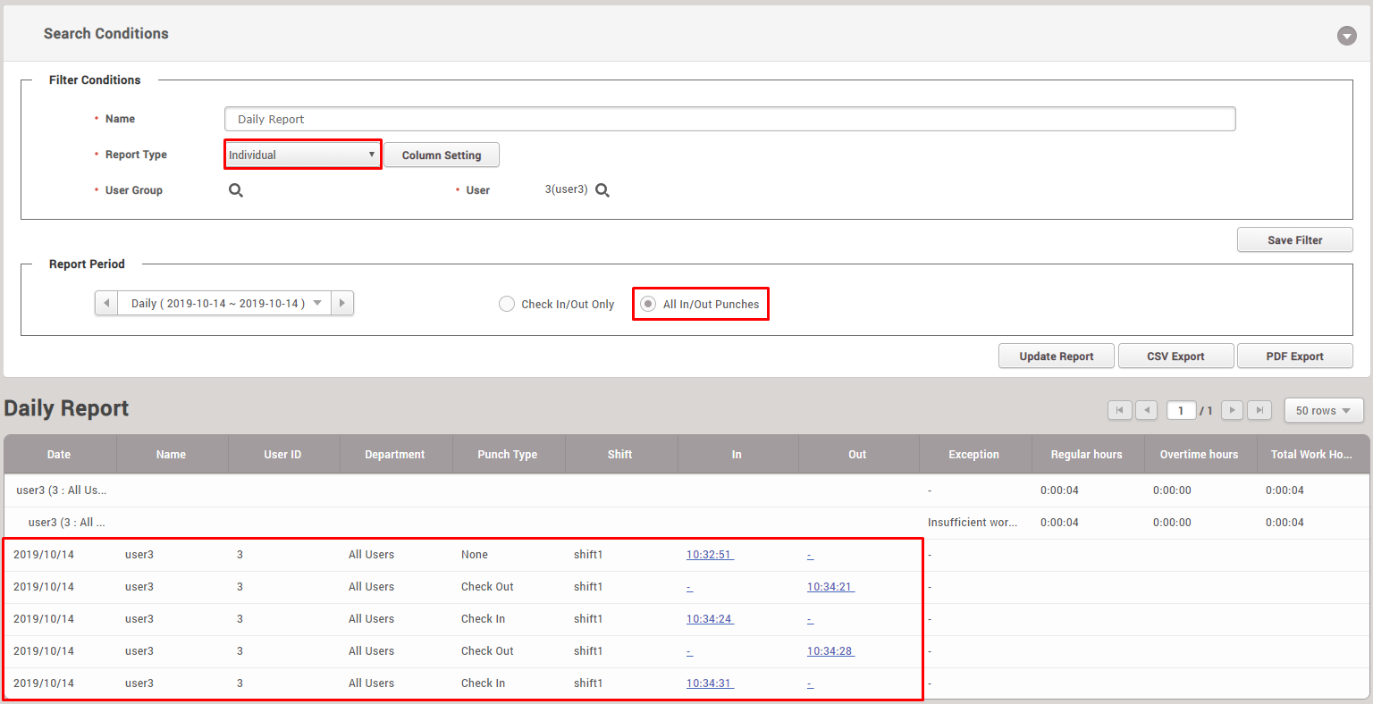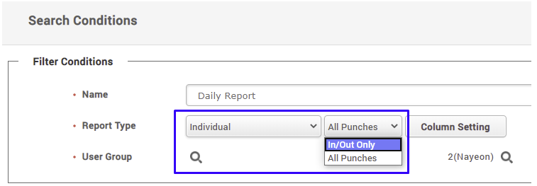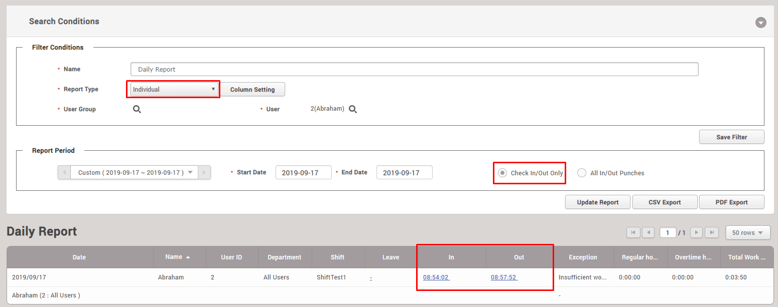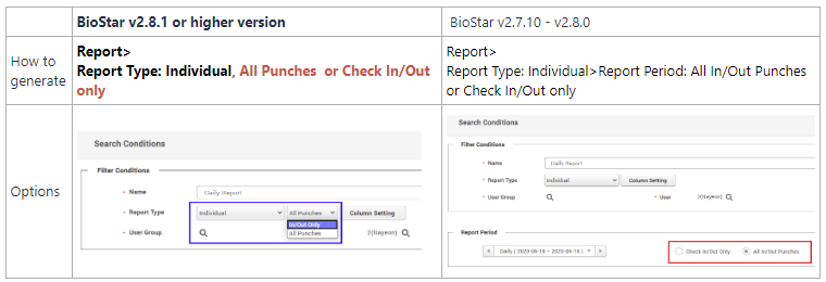 Old revisions Add to book Export to PDF Fold/unfold all Table of Contents 'First in & Last out' or 'All In/Out Punches' Options in the Individual Report 1. 'Check In/Out Only' option 2. 'All In/Out Punches' option 3. Moved the options of Individual report for showing In/Out only or All Punches (BioStar 2.8.1 or later) Book Creator Add this page to your book Book Creator Remove this page from your book Manage book (0 page(s)) Help 'First in & Last out' or 'All In/Out Punches' Options in the Individual Report Before BioStar 2.7.10, you could see the first in and last out data only in the T&A report. If you wanted to check the user's all in data, then you had to click the 'In' part and see from the pop-up window. However, from BioStar 2.7.10, you can choose the individual report type between 'Check In/Out Only' and 'All In/Out Punches'. This feature is supported only in the 'Individual' report. Suprema upgraded this feature to be more user-friendly in the BioStar 2.8.1. Please check subject 3 if you are using BioStar 2.8.1 or later. 1. 'Check In/Out Only' option This is the default option as the former BioStar 2 server. You can see the first in data and the last out data in the default report. If you want to check the all in and out data, you need to click 'In' and 'Out' data from the table. 2. 'All In/Out Punches' option When you select this option, you can check all in and out data from the individual report. You can see the all in and out data from the top of the report and the summarized data at the bottom. When you click 'In' and 'Out' data from the table, you can see the pop-up and edit the punch logs as before. 3. Moved the options of Individual report for showing In/Out only or All Punches (BioStar 2.8.1 or later) From BioStar v2.8.1, the options are shown once you click the individual report type in Report Type. [Table 1. How to check All In/Out Punch Data or Check In/Out only for each of the version of BioStar 2] [Table 2. Big Image : How to check All Punches - BioStar v2.8.1 or higher version]