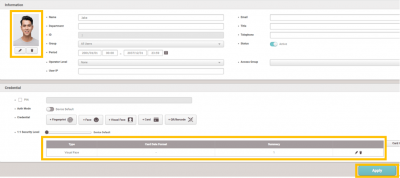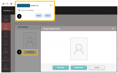 Old revisions Add to book Export to PDF Fold/unfold all Table of Contents How to Use the New Feature "Enroll Profile Photo & Visual Face Using a Webcam" Expectation effectiveness Major Features Precautions How to enroll the visual face and user profile using a webcam Step 1. Connect a webcam to your PC first and log in to BioStar 2. Step 2. Click USER and then click ADD USER. Then, select a user for whom you want to enroll the profile photo using a webcam. Step 3. Click "Add Photo". Then, click "Allow" if you see the popup requesting permission to access the browser's camera. Step 4. You can see the screen displayed through the webcam activated in the "Image Registration" pop-up. Then, bring your face to the webcam and click "Take photo". Note that following steps are for enrolling the visual face credential with the taken photo. [Optional] Step 5. Check the option "Use as Visual Face Credential" about the photo pictured by the webcam and click OK. [Optional] Step 6. Then, the photo will be enrolled as both the user's profile image and visual face credential automatically. To complete the enrollment, click Apply. Demo Book Creator Add this page to your book Book Creator Remove this page from your book Manage book (0 page(s)) Help How to Use the New Feature "Enroll Profile Photo & Visual Face Using a Webcam" Affected Version: BioStar v2.9.5 or above From v.2.9.5 of BioStar 2, the function “Enroll Profile Photo & Visual Face Using a Webcam” has been introduced. With this new function, the user can add a photo taken by a webcam connected to a PC to be used as a user's profile or a visual face credential. Visual Face Credentials created with photos taken with a PC webcam are only compatible with FaceStation F2 and BioStation 3 devices. Expectation effectiveness This new function is expected to be helpful in sites where enrolling the visual face credential through the devices is difficult. Major Features 1. To use this new feature, you need to have a PC installed with a webcam first. Then, when you receive the request for permission to access the browser's camera, you need to grant it. Depending on the browser, the process for granting permission to use the camera may vary. BioStar 2 recommends using Google Chrome version 75 or higher. This feature can only be used to [HTTPS], and it does not support HTTP. Please make sure BioStar 2 Setting is enabled with HTTPS. 2. You can also upload a photo from your PC to enroll by clicking Upload photo. However, you need to be cautious about the below items. The supported image file size is up to 10MB. Supported image file formats are JPG, JPEG, and PNG. After clicking Take Photo, it may take a few seconds for the photo to be taken. Precautions You need to be cautious about the below items when enrolling a visual face by using a webcam. Maintain a reasonable distance from the webcam. Enroll your face straight ahead without moving. Do not change the user's facial expression. Do not enroll a face while the user is wearing masks, hats, or eye patches. Do not enroll a face with the user raising their head or bowing. Do not wear thick makeup. ‒ Users should not enroll their faces with their eyes closed. Make sure that both of the user's shoulders correctly appear on the screen. Be careful not to display two faces on the screen. Enroll one person at a time. How to enroll the visual face and user profile using a webcam Step 1. Connect a webcam to your PC first and log in to BioStar 2. Step 2. Click USER and then click ADD USER. Then, select a user for whom you want to enroll the profile photo using a webcam. Step 3. Click "Add Photo". Then, click "Allow" if you see the popup requesting permission to access the browser's camera. If the webcam has been activated usually, you can see the red icon of the screenshot below in the BioStar 2 tab of the browser after clicking “+Add Photo”. Step 4. You can see the screen displayed through the webcam activated in the "Image Registration" pop-up. Then, bring your face to the webcam and click "Take photo". After clicking “Take photo”, it may take a few seconds for the photo to be taken. You need to use the option “Upload photo” to use the photo stored already on your PC instead of taking a photo. Note that following steps are for enrolling the visual face credential with the taken photo. [Optional] Step 5. Check the option "Use as Visual Face Credential" about the photo pictured by the webcam and click OK. Use as profile image: If you check this option and click OK, the photo pictured by the webcam or the photo uploaded from your PC will be enrolled in the user profile image. Use as Visual Face Credential: If you check this option and click OK, the photo pictured by the webcam or the photo uploaded from your PC will be enrolled as the user's visual face credential. If then, you can authenticate on devices that support a visual face. [Optional] Step 6. Then, the photo will be enrolled as both the user's profile image and visual face credential automatically. To complete the enrollment, click Apply. Demo