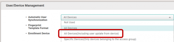 Old revisions Add to book Export to PDF Fold/unfold all Table of Contents Overview of "All Devices (Including User Update from Device)" – An Automatic User Synchronization Option 1. What is This Function? 2. Case Studies Case 1. Possible Synchronization from Device to Server: Case 2. Not Synchronized from Device to Server: Overview of "All Devices (Including User Update from Device)" – An Automatic User Synchronization Option BioStar 2 supports Automatic User Synchronization, which ensures that existing and updated user data (added, modified, or deleted) on the BioStar 2 server is synchronized to all connected devices. Four synchronization options are available. Not Used All Devices All Devices(Including user update from device) Specific Devices(Only devices belonging to the access group) This article focuses on the All Devices (Including user update from device) option and provides case studies to illustrate its behavior. For more details, you can refer to the contents below. 1. What is This Function? When using All Devices (Including User Update from Device), user information (added, modified, or deleted) on the BioStar 2 server is automatically synchronized with all connected Suprema devices. This behavior is identical to the All Devices option.The key difference is that this option also allows new users added directly on a device to be synchronized back to the server. Important Note: “Including User Update from Device” does not synchronize modifications or deletions made on a device to the server. Only newly added users are synchronized from the device to the BioStar 2 server. 2. Case Studies Please refer to the following examples to distinguish which case is possible and which case is impossible to synchronize the user data from the device to the BioStar 2 server if using the function All Devices(including user update from device). Case 1. Possible Synchronization from Device to Server: A new user is added directly via the device. A new credential is added to an existing registered user. Additional information (e.g., user name) is added to an existing user. etc Case 2. Not Synchronized from Device to Server: Modifying the expiration date of an already registered user via the device. Changing the name of an already registered user directly on the device. etc