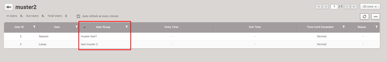 Old revisions Add to book Export to PDF Fold/unfold all User group sorting and user ID sorting are available in <Muster Status> Since BioStar 2.7.11, you can be sorted by user ID and user group ID in <Muster Status>. For more information about sorting user ID, please refer to the article below. User ID sorting depending on the user ID type setting in the server Until BioStar 2.7.10, user group ID sorting did not work properly for <Muster Status>. Starting from BioStar 2.7.11, you can be sorted correctly by user group name. BioStar 2 > MONITORING > Zone Status