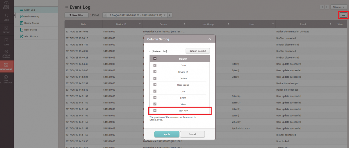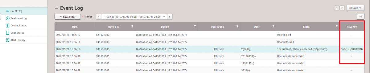 Old revisions ブックに追加 PDF の出力 全て展開する/折り畳む ブッククリエイター このページをブックに追加します。 ブッククリエイター このページをブックから削除します。 修正したブックを表示する。 (0 ページ) ヘルプ システム構成, BioStar 2 モニタリングイベントログへの勤怠キー列の追加 BioStar 2.5.0以降から、モニタリングのイベントログで勤怠キー列を確認することができます。 1. モニタリング(MONITORING)メニューに移動してください。 2. 右上のを押してカラム設定(Column Setting)をクリックします。 3. 勤怠キー(TNA Key)をチェックして選択してください。 ユーザーが勤怠管理デバイスでCHECK INまたはCHECK OUTすると、勤怠キー(TNA Key)列にログが記録されます。 この列はイベントログ(Event Log)またはリアルタイムログ(Real-time Log)で確認できます。
